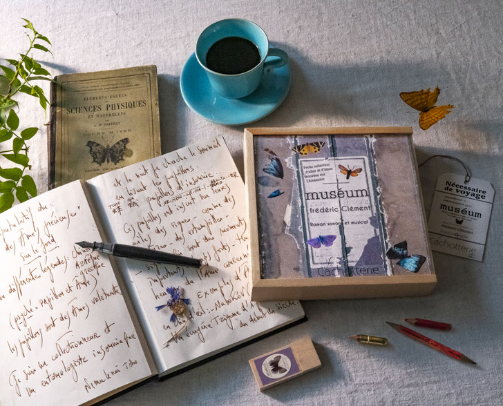 Avant "MUSÉUM", roman papier, puis aujourd'hui, en roman sonore & musical, il y eut un Carnet de notes ... Ici les premières idées et les premières recherches manuscrites. Depuis la mi-novembre 23, "MUSÉUM" est aussi un coffret en bois naturel. Dedans une clef avec la voix et les musiques de frédéric Clément + à 24 cartes de ses illustrations.